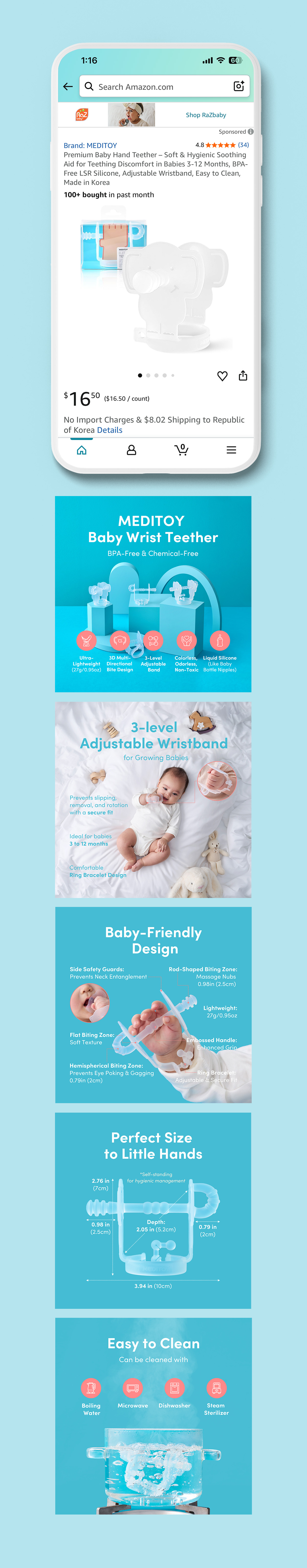 Meditoy는 유아용 치발기 제품을 중심으로 한 유아 용품 브랜드로, 국내에서 입지를 얻은 후 아마존 입점을 통해 글로벌 소비자를 타겟으로 판매를 시작하고자 했습니다.