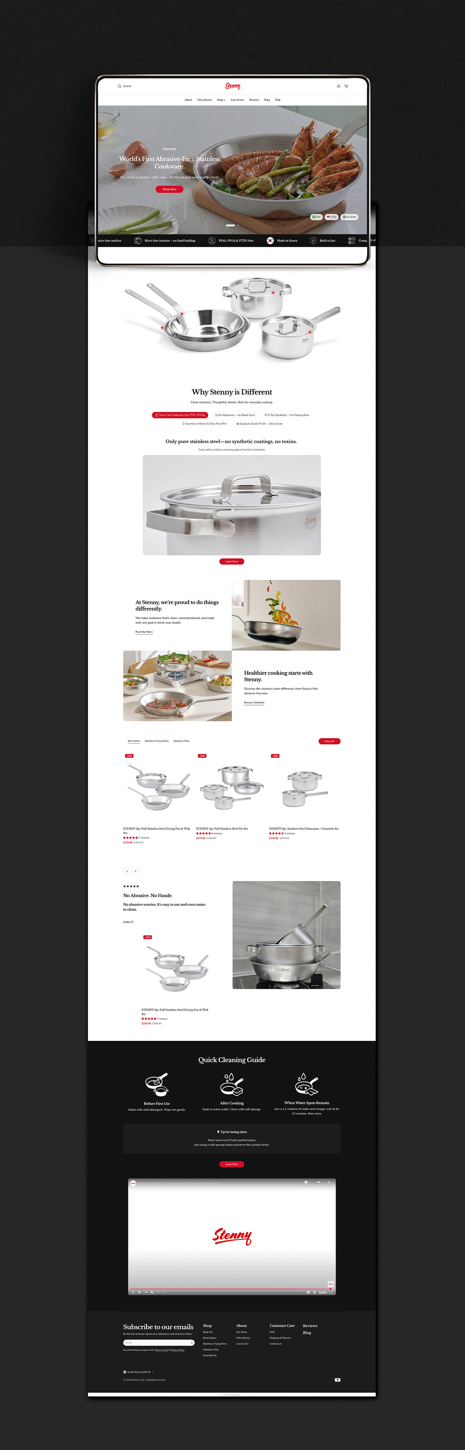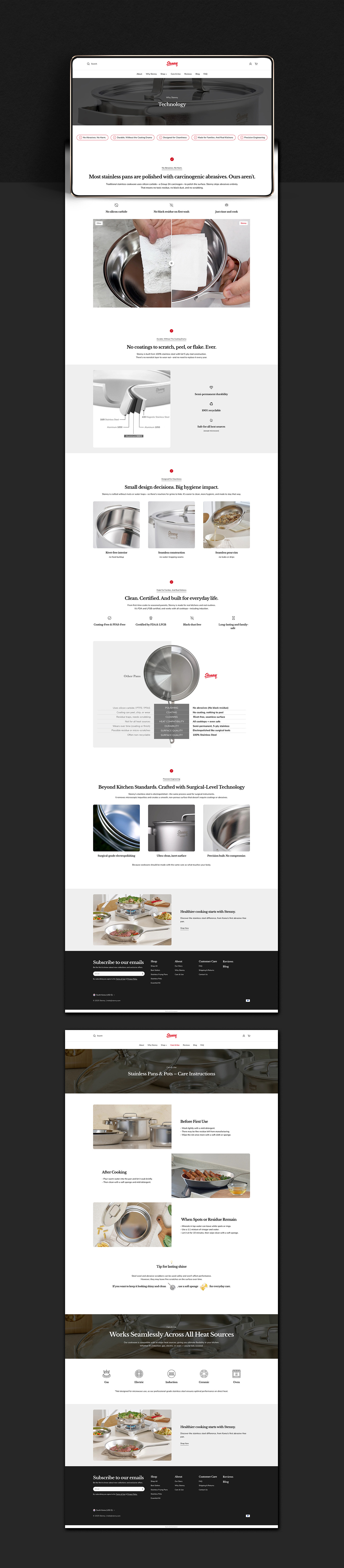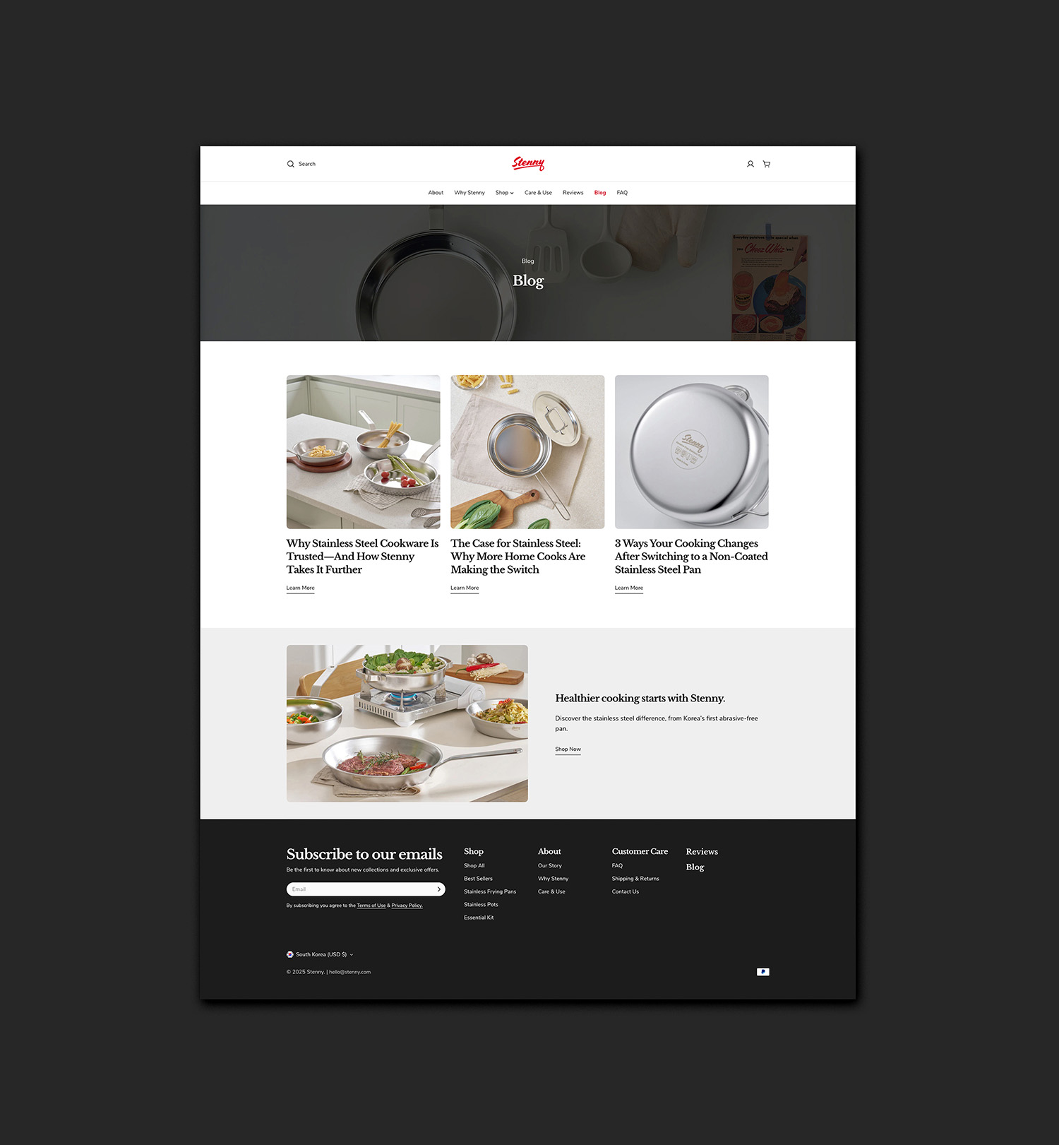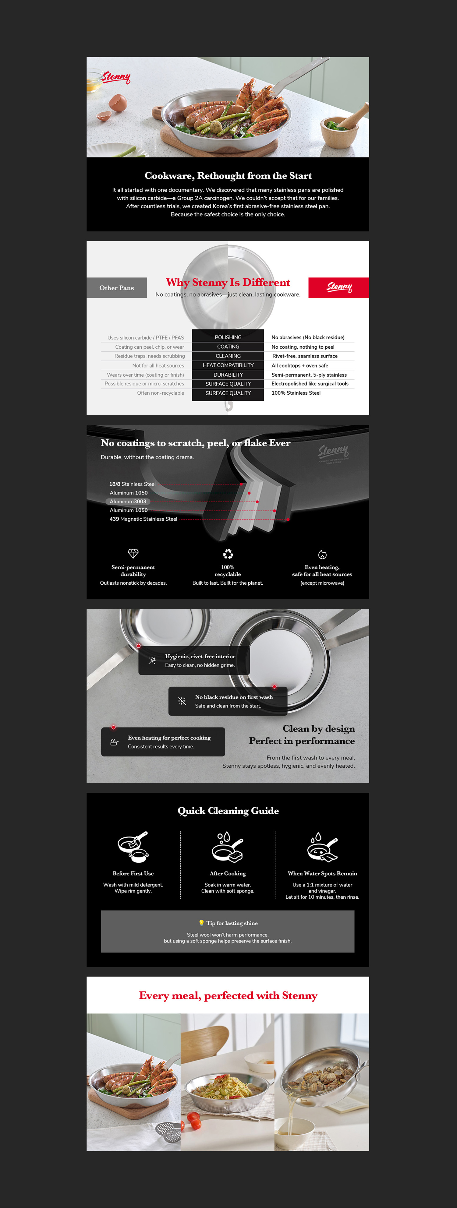 브랜드 아이덴티티를 정립하고, 기술 페이지 및 Care & Use(세척 및 사용 가이드) 페이지를 운영하여 제품 이해도를 높였습니다. 스테인리스 제품에 대한 오해를 최소화하고 프리미엄 브랜드 이미지를 강화함으로써, 구매 신뢰도를 높이는 구조를 구축했습니다. 이를 기반으로 안정적인 매출 흐름을 형성했습니다.