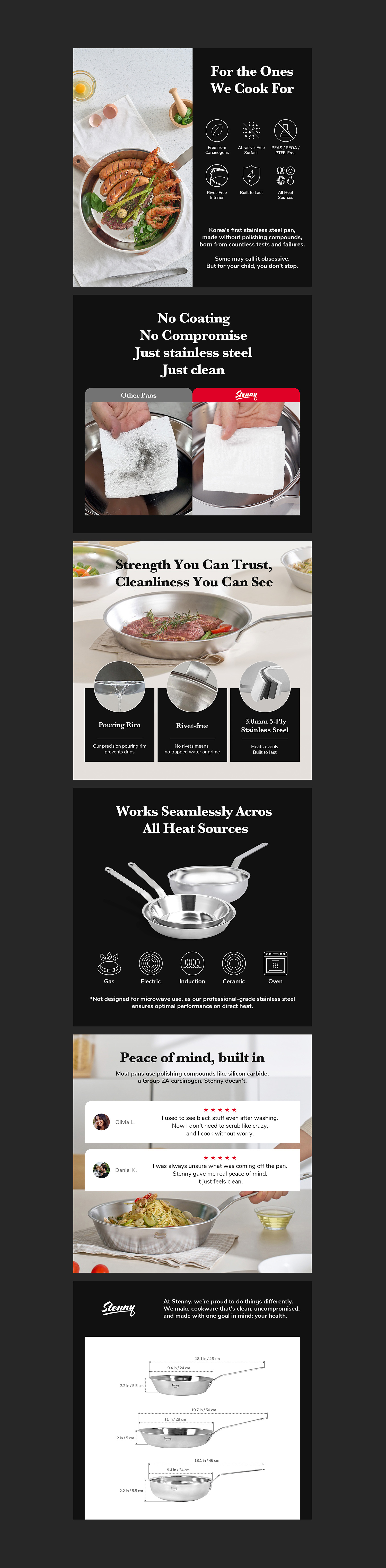 STENNY는 국내 중심으로 운영되던 브랜드로, 글로벌 시장 진출을 위해 신규 웹사이트 구축이 필요한 상황이었습니다. 기존 사이트는 감성 이미지 중심의 긴 상세 구조로 구성되어 있어 글로벌 소비자 기준에서는 정보 전달력이 낮은 한계가 있었습니다. 해외 타깃 시장과 경쟁 브랜드 분석을 통해 정보 탐색 구조를 재정의하고, 글로벌 직접 판매가 가능한 웹 전략을 수립했습니다.