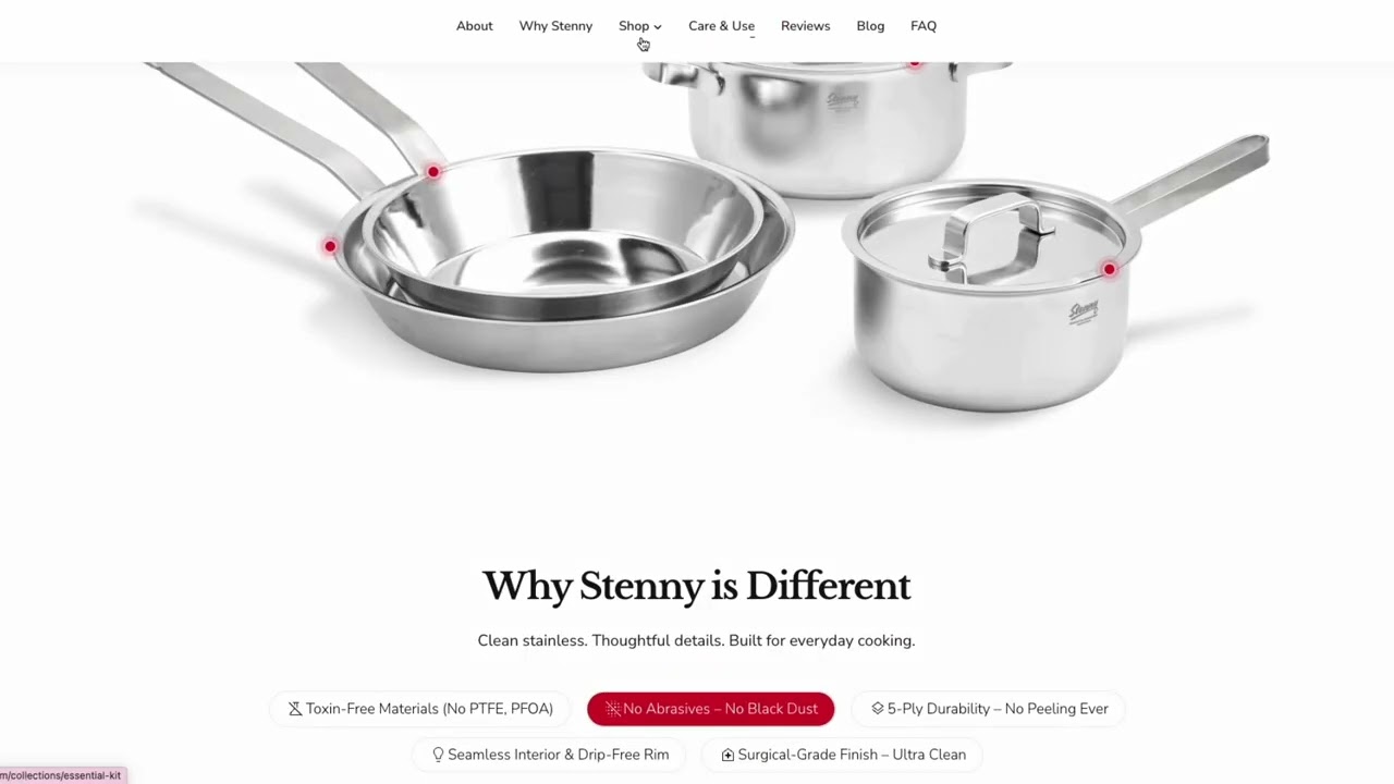 국내형 상세 페이지 구조를 재정비하고, 핵심 강점이 초반에 명확히 전달되도록 콘텐츠 우선순위를 재정렬했습니다. 메인 홈에서는 주요 장점을 간결하게 제시하고, ‘Why STENNY’ 기술 페이지를 별도로 구성하여 전문성과 차별성을 체계적으로 설명하는 이원화 구조를 설계했습니다. 그 결과 오픈 2주 차 일 매출 1,000달러를 달성하며 초기 전환 성과를 확보했습니다.